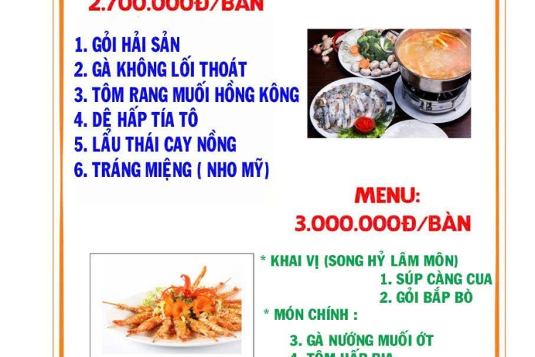 1. GỎI CỦ HŨ DỪA 2. GÀ BÓ XÔI 3. TÔM Ủ MUỐI 4. DÊ HẤP TÍA TÔ 5. LẨU CÁ TẦM + BÚN 6. TRÁNG MIỆNG (NHO MỸ)